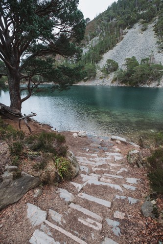 Ten minutes drive from Aviemore, through stunning scenery, you’ll find Loch An Eilein. The name means ‘Loch of the island’, as there is a small island with a castle in the middle of the loch. Though we arrived to a busy car park, the 5.5km loop around the loch was mostly quiet as there’s so much forest to deaden the sound, and so much space to explore! The walk took us just under 1.5 hours as we enjoyed a leisurely stroll through the pine woods, admiring the mountains and spending some time sitting by the water’s edge to appreciate just how tranquil this place is. We made a couple of four-legged friends along the way as the trail is very dog-friendly, with well-maintained paths and spot for dogs to jump in the loch for a dip. We were lucky to spot some red squirrels high in the trees too!