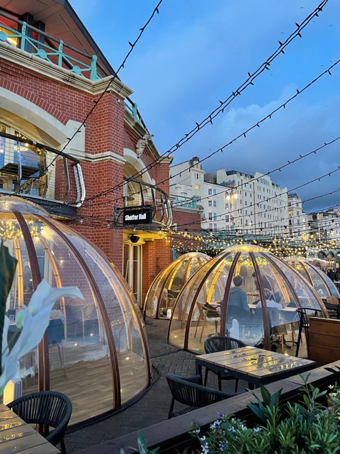 Along the seafront, Shelter Hall is an indoor food market offering a variety of dishes from 7 different independent stalls, and it’s our top pick for a meal out in the city as you’ll find something for everyone! At Christmas time the market hall is BURSTING with festive decor, and each of the vendors here offer up seasonal treats, from gravy-drenched chicken burgers with crumbled stuffing, to deep fried brie bites with cranberry sauce. There’s a mezzanine area upstairs with a stunning view over the sparking decor, and the spacious area downstairs is dog-friendly so you can bring your pooch along too. A variety of festive events take place at Shelter Hall in the run up to Christmas, including local choirs, live music, a Santa’s Grotto and private, heated igloos on the outdoor terrace where you’ll enjoy a Wintery view over Brighton beach from the warmth of your igloo.