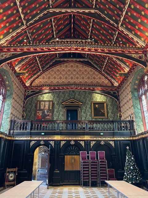 At Queens’ College you can take a walk through the Old Court, featuring some of the best-preserved medieval architecture in the city, as well as Cloister Court where you’ll see the President’s Lodge – the oldest building on the River in Cambridge as it was built around 1460. Queens’ is one of two Cambridge colleges whose main buildings straddle the River Cam, and when you visit here you can walk over the River via the famous Mathematical Bridge. It’s definitely worth a stop in at the Old Hall, with its impressive ceiling and fireplaces, where you’ll find a festive tree or two decorated for the season. The Chapel is also well worth a visit – for its impressive stained glass windows and symmetrical pews on either side – as well as a place to come out of the cold!