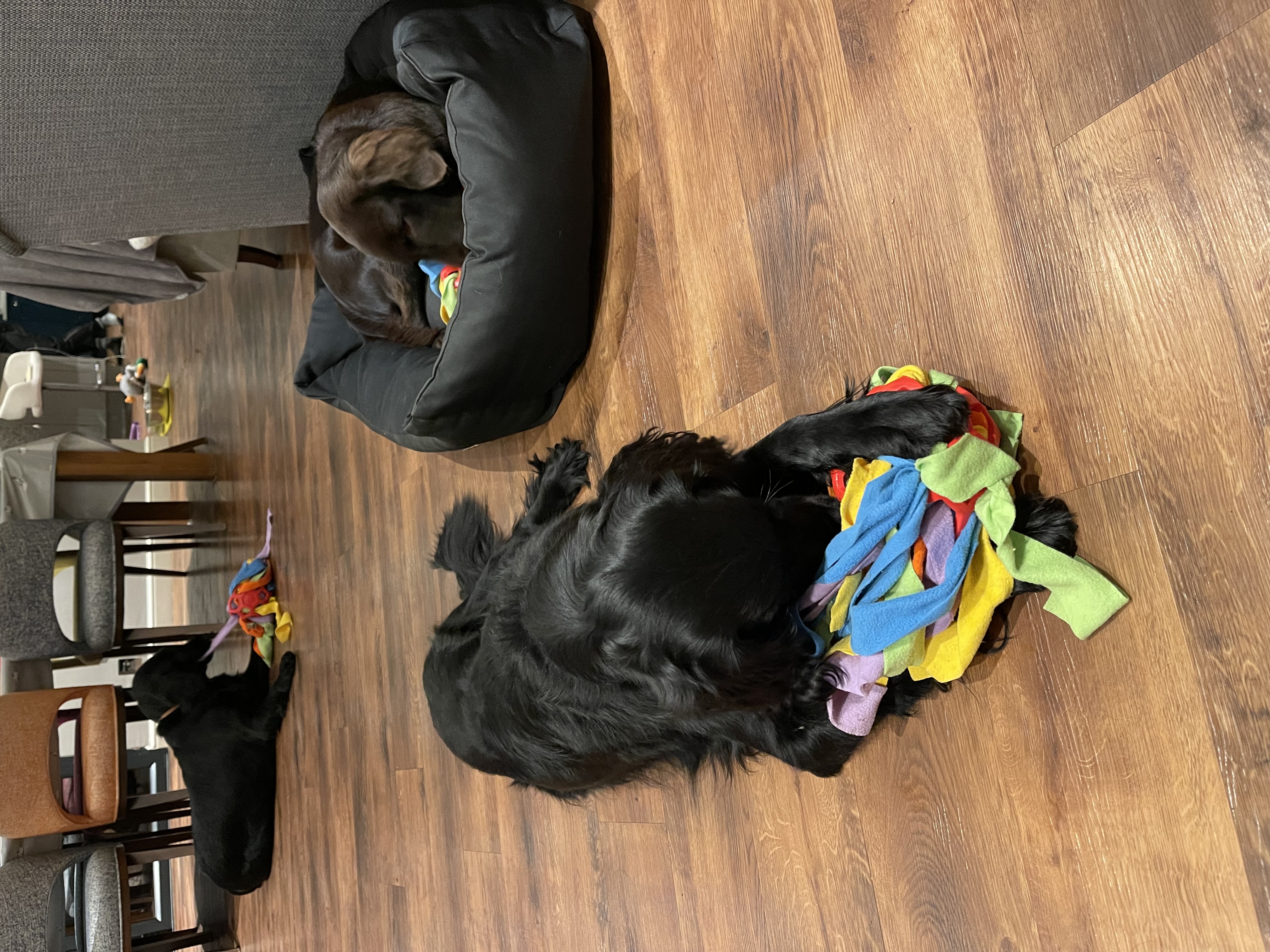 If you do have to forgo a walk, but you’re caring for an energetic dog, playing games that work the dog mentally can be just as good to give them some mental exercise while ensuring they stay safe. Chris loves to hide toys around the house for dogs to find – like a sweet game of hide and seek with their favourite things! Enrichment toys are a great way to use up some of their excess energy, as experts say that just 20 minutes of playing with enrichment toys is equivalent to an hour’s walk in terms of stimulation. Whether it’s a snuffle mat filled with biscuits to find, a puzzle toy they have to work out and nudge around, or a Kong stuffed with their favourite treat, these kinds of interactive toys can be hugely beneficial for keeping your dog entertained and ensure they get the ‘exercise’ they need. Owners don’t always have these kinds of toys when we’re pet sitting, but you can always improvise with biscuits underneath plastic cups, folding treats into blankets so the dog has to dig for them, or setting up a ‘treasure hunt’ (we once made an Easter egg hunt for a small terrier while pet sitting – very wholesome to watch!)
